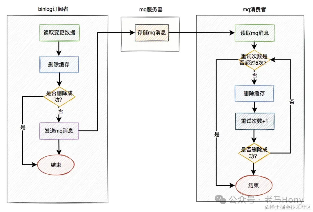 在binlog订阅者中做缓存删除工作时,如果按照图中的方案进行删除缓存,只删除了一次,也可能会失败。所以这里就需要加上前面聊过的重试机制了:如果删除缓存失败,写入重试表,使用定时任务重试;或者写入mq,让mq自动重试。