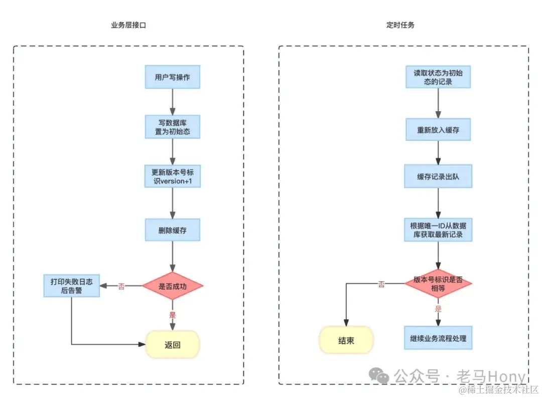 如下图,先操作数据库,每次更新数据库时,版本号都会+1,并且状态更新为初始态,然后再删除Redis缓存队列。这样的话即使缓存删除失败(Redis队列中老的记录没被删除),只要数据库的已经更新成功,后面业务再消费redis队列记录的时候,可以通过version版本号进行判断记录是否过期或者是否是重复的数据。