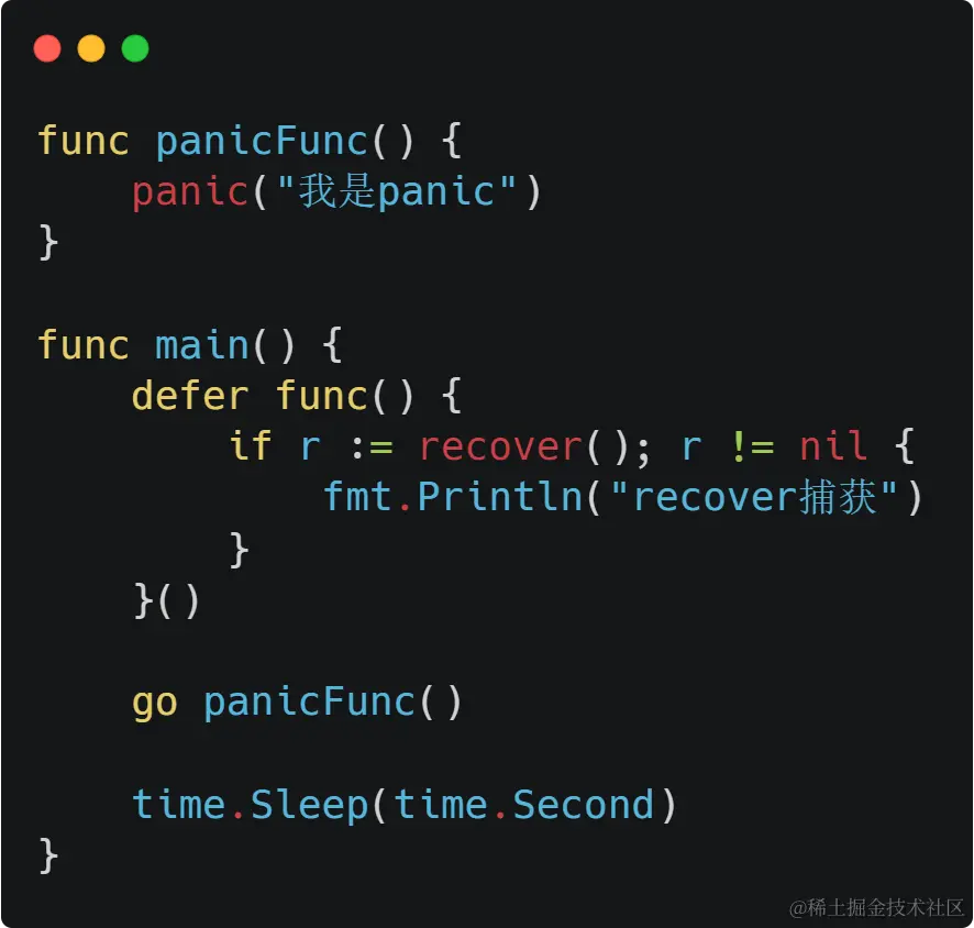 这是因为,抛出警告的代码是在一个新的 goroutine 中发生的,通过 go panicFunc运行。而只有panic触发和调用recover在同一个goroutine 中时,recover才能捕获成功。