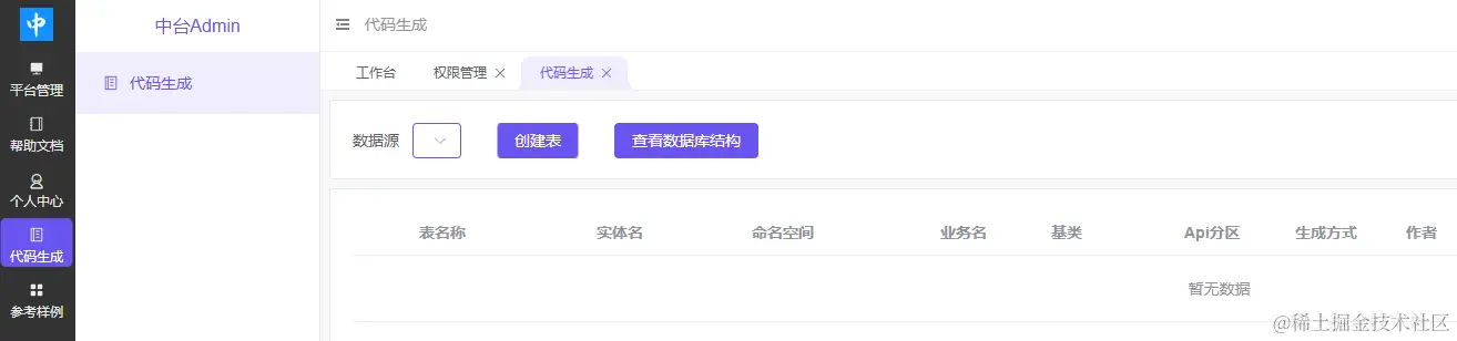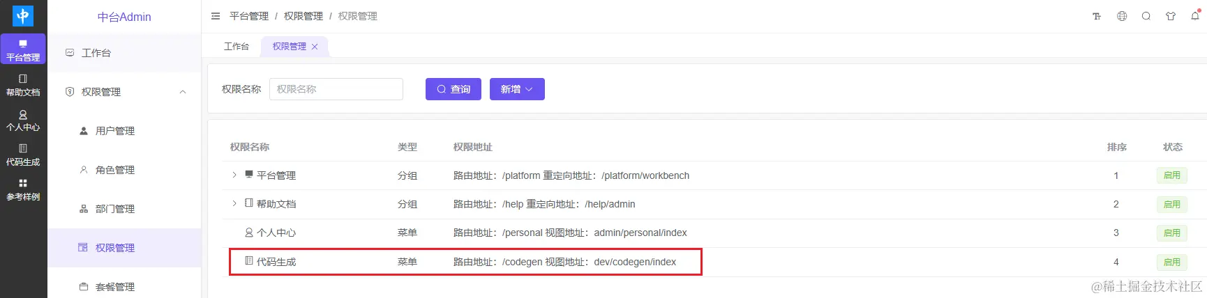 - 权限管理-权限管理中添加对应菜单(路由地址:/codegen,路由命名:devgen)