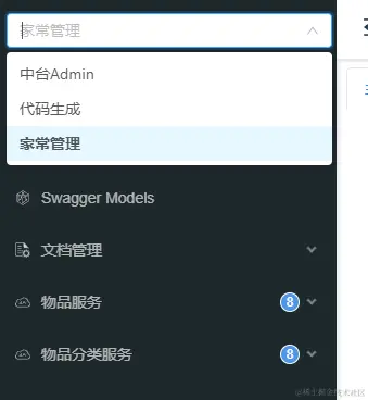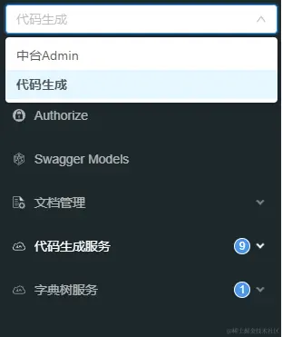 "swagger": { //启用 "enable": true, "projects": [ { "name": "中台Admin", "code": "admin", "version": "v8.2.0", "description": "" }, { "name": "代码生成", "code": "dev", "version": "v8.2.0", "description": "" } ] }