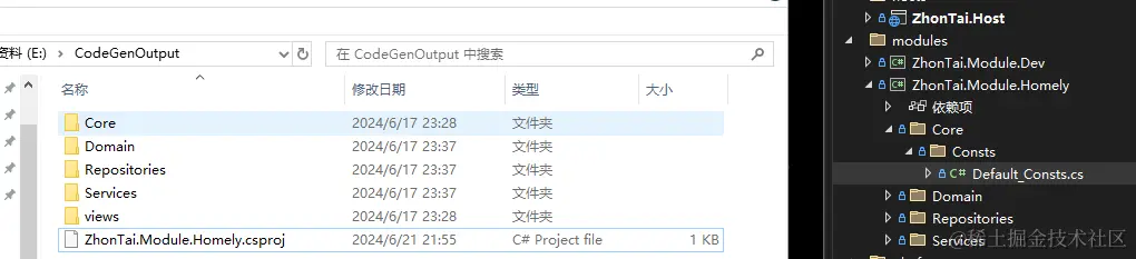第二步:生成代码后,将【后台代码】其拷贝到对应模块文件夹 ZhonTai.Module.Homely 中,并添加类库添加到 modules 文件夹(可根据需要分离 Default_Consts 内容,其中包含了路由前缀,数据库键值的默认配置,Core 文件夹只第一次使用,后续生成可以只覆盖实体&仓储&服务)