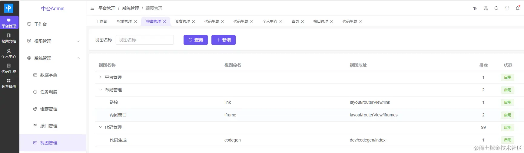 - 系统管理-视图管理中添加对应的视图(代码中的路由的定义,地址为 dev/codegen/index)