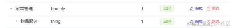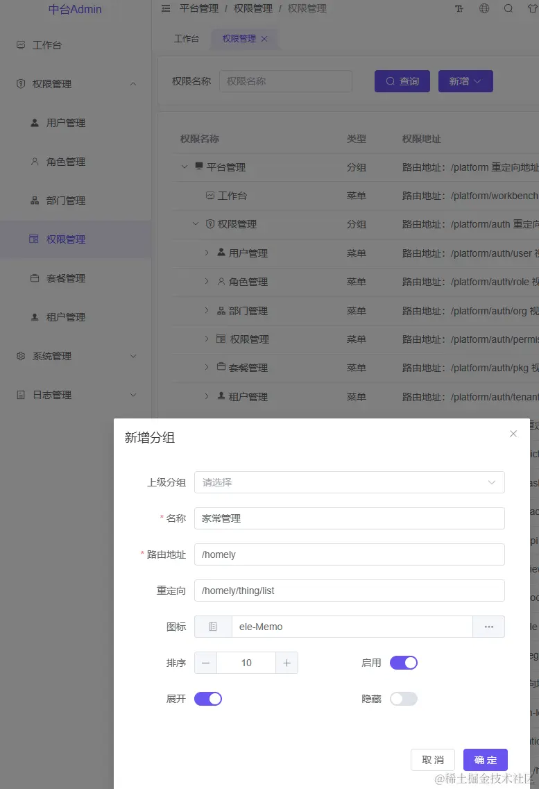 第四步:因为是模块的第一个服务,所以需要先在权限管理中创建一个【家常管理】的分组,这里的名字和代码生成器中填写的父菜单需要一致,否则无法生成菜单