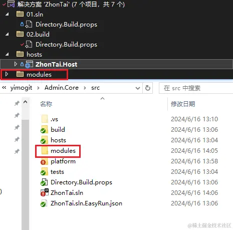添加 modules 文件夹及解决方案文件夹,存放模块代码
