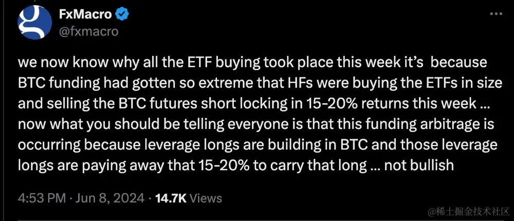 这很可怕。但也许更为轻松的答案是,机构正在通过比特币现货和期货进行套利。