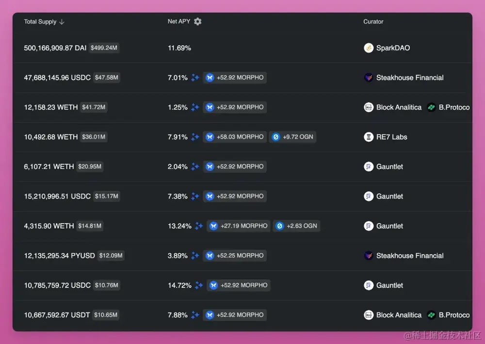 更重要的是,DeFi 协议也在进行调整,允许 DeFi 中的「麦肯锡」管理用户资产并将风险管理外部化。比如,Morpho Blue 的无许可借贷允许 DeFi 中的「麦肯锡」创建具有任何资产和风险参数的市场,而无需依赖治理。其中,最受欢迎的财库由 Gauntlet、Steakhouse、RE7 Labs 等管理。