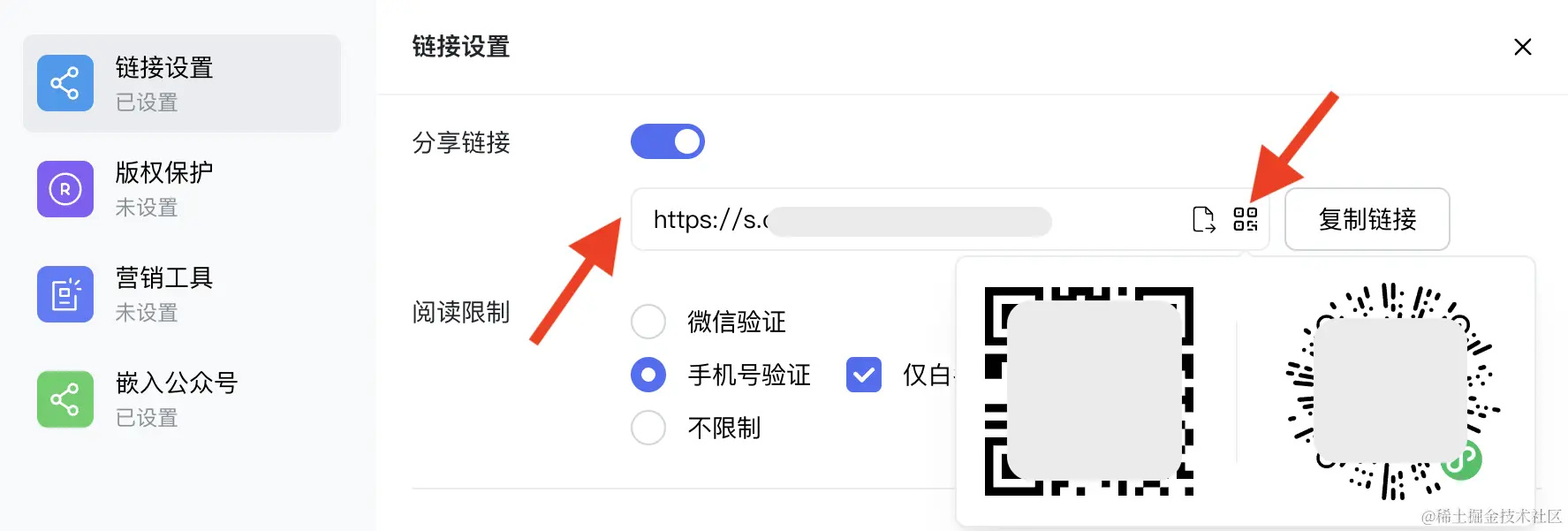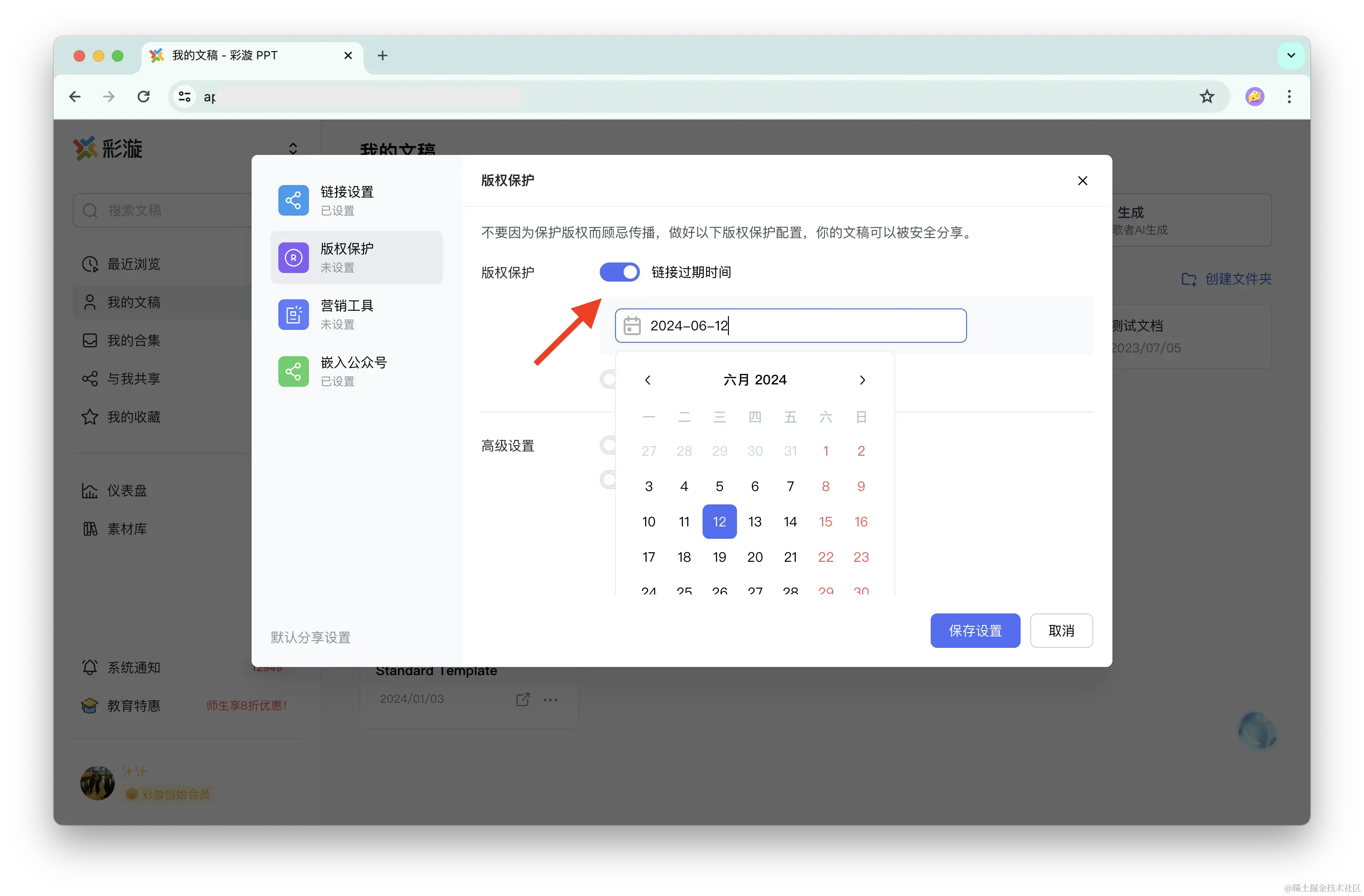 进入「分享设置」-「版权保护」中,开启「链接过期时间」并选择到期时间,保存设置