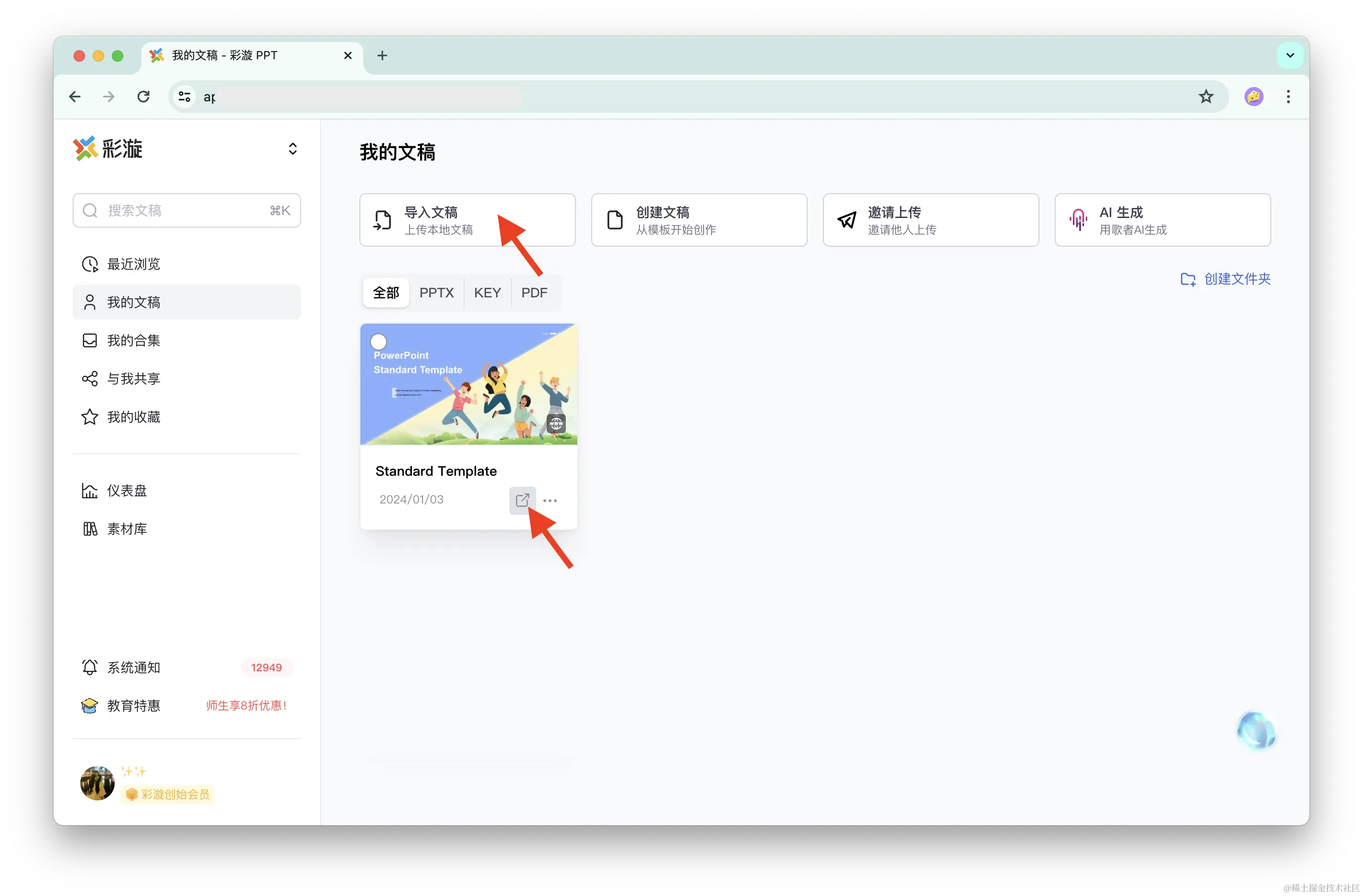 将 PPT 或 PDF 上传到彩漩 PPT(caixuan.cc),并开启文档分享