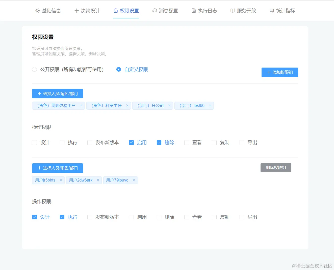 权限设置,针对不同成员(角色、部门、群组)可灵活设置不同的操作权限