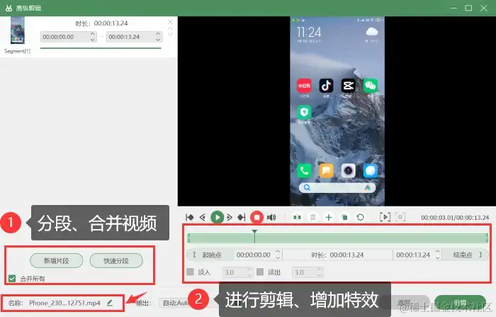 步骤5:录制好的视频,您可以进入 【高级剪辑】 对您的视频进行分段、合并、剪辑、增加特效等后期处理。