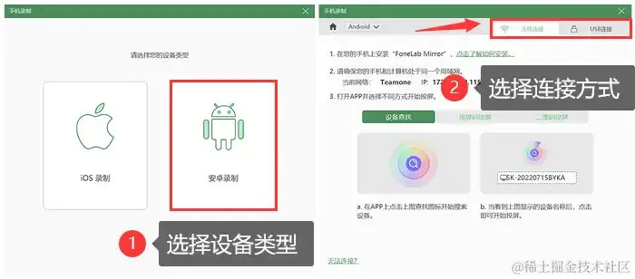 步骤3:小米手机选择 【安卓录制】 进行操作,选择一个适合您的连接方式,根据屏幕上的步骤提醒进行连接。