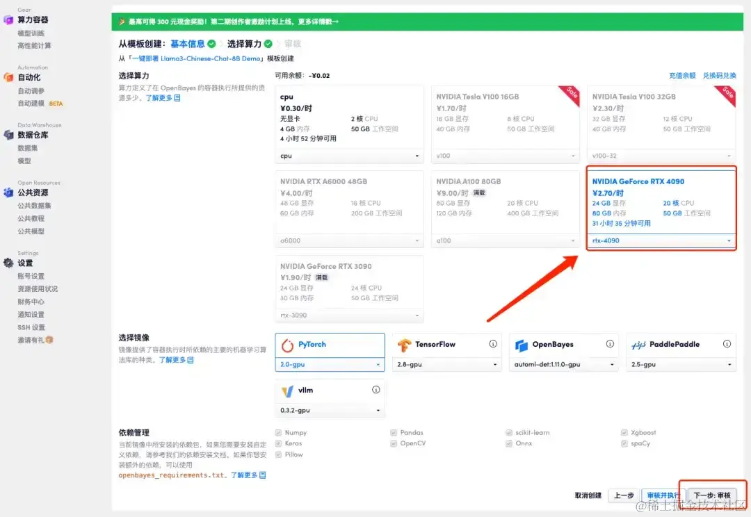 - 页面跳转后,选择「NVIDIA GeForce RTX 4090」,点击「下一步:审核」。新用户使用下方邀请链接注册,可获得 4 小时 RTX 4090 + 5 小时 CPU 的免费时长!