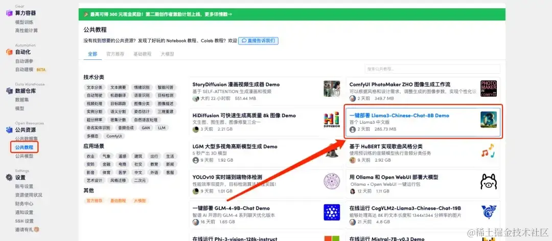 - 登录 OpenBayes.com,在「公共教程」页面,选择「一键部署 Llama 3-Chinese-Chat-8B Demo」。