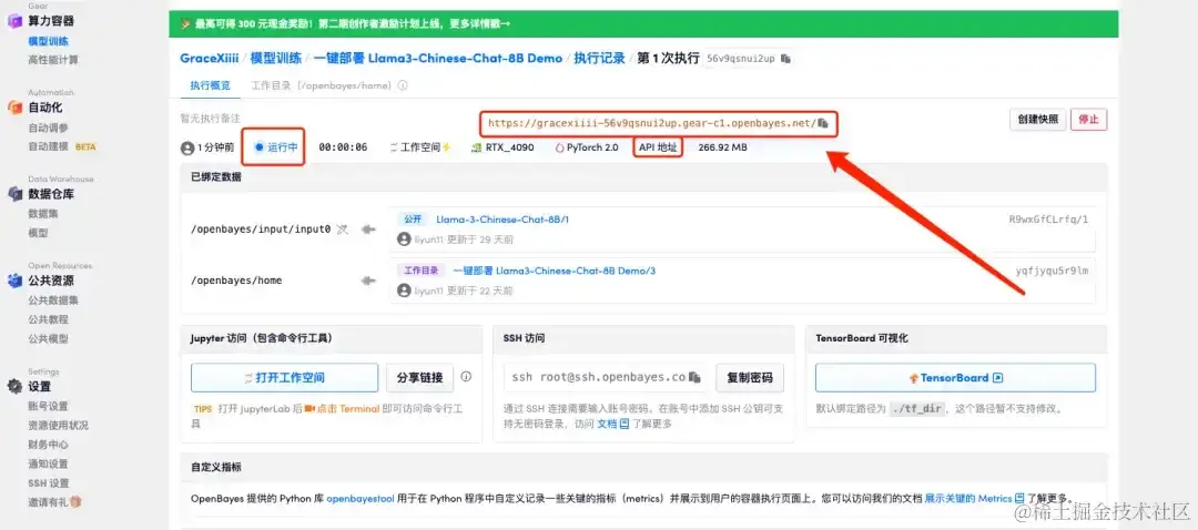 - 点击「继续执行」,等待分配资源,首次克隆需等待 3 分钟左右的时间。当状态变为「运行中」后,将鼠标移动至「API 地址」后,复制该地址并在新标签页打开,即可跳转至 Llama 3-Chinese-Chat-8B Demo 页面。请注意,用户需在实名认证后才能使用 API 地址访问功能。