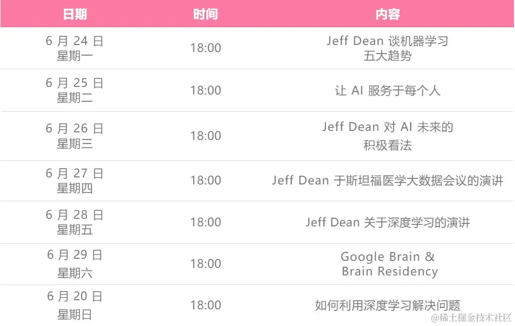 | 6 月 24 日星期一 | 18:00 | Jeff Dean 谈机器学习五大趋势 |