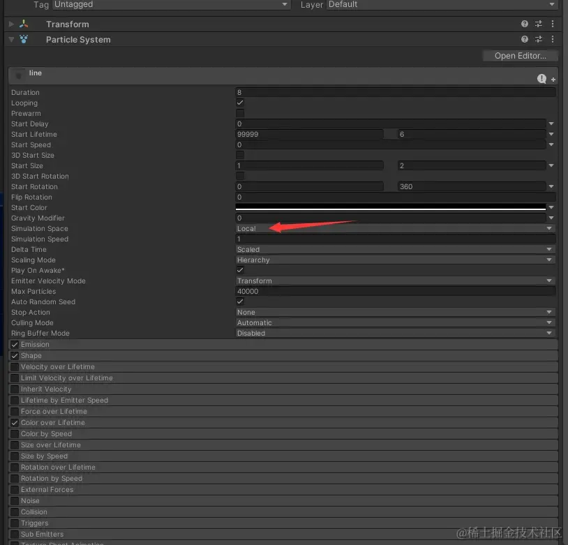 Q:我这个粒子系统是Local的,当我移动或者旋转父物体时候,旧的粒子会时刻跟着父物体移动,怎么能让旧的粒子原地不动呢?