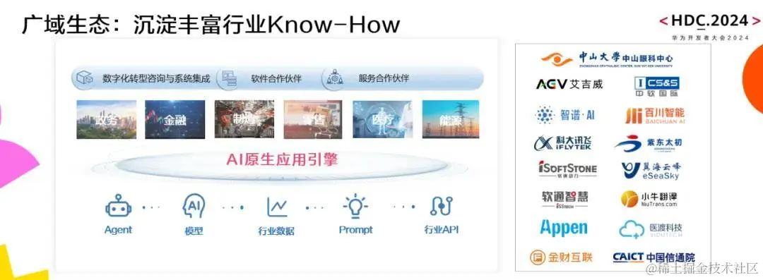 就在华为开发者大会2024现场,华为云AI原生应用引擎携手中山眼科、艾吉威、百川智能、智谱华章、紫东太初、中软国际、软通动力、翼海云峰、小牛翻译、医渡科技、金财互联、信通院人工智能研究所等客户、合作伙伴及研究机构,联合发布了“AI原生应用引擎全域生态合作启航”仪式,凝结跨行业、多维度的创新力量,群策群力加速全行业智能化转型。