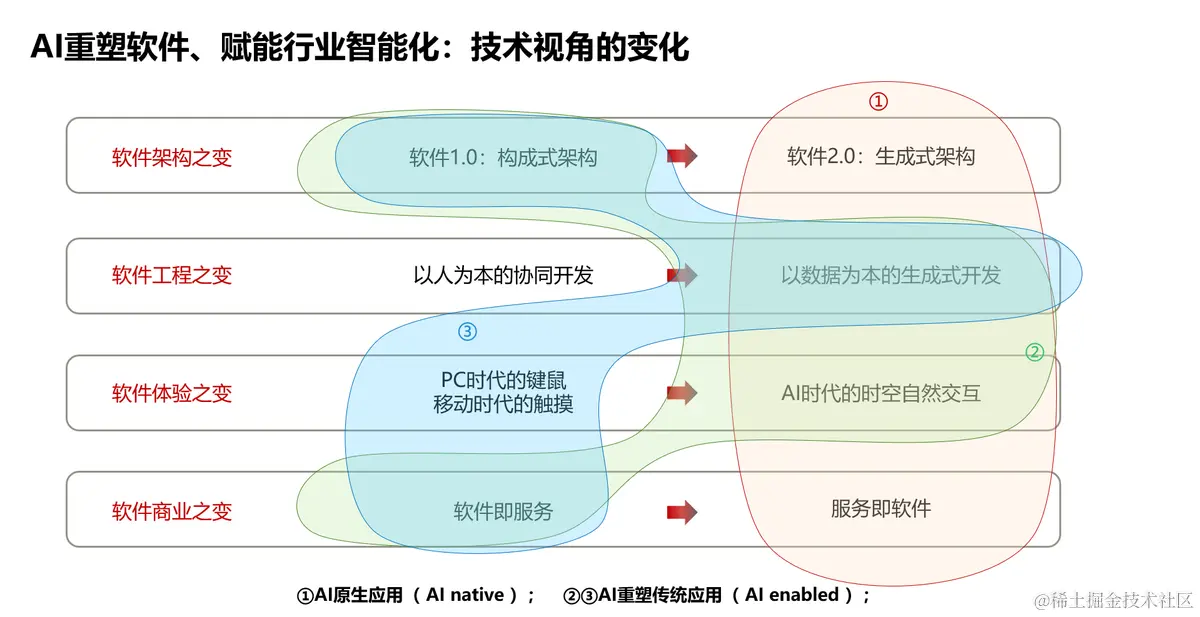 **软件架构之变:**传统程序或软件1.0是构成式架构,是精心设计的、确定性的,而AI原生软件或软件2.0是以大模型为底座的生成式架构。
