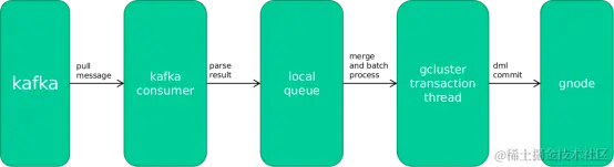 Kafka consumer 从 kafka 里拉取消息,解析消息中描述的操作类型、表名称、主键 名称、列名称和数据,以中间结果的形式,暂存到本地队列;事务线程从本地队列 取出数据,进行合并、攒批后,以事务方式组织 dml 语句,发到 gnode 执行,最终 提交。