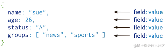 - 文档中的值不仅可以是在双引号里面的字符串,还可以是其他几种数据类型(甚至可以是整个嵌入的文档)。