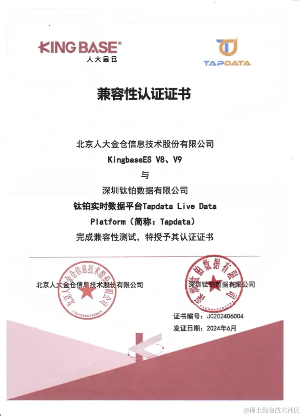 近日,深圳钛铂数据有限公司(以下简称钛铂数据)自主研发的**钛铂实时数据平台(TapData Live Data Platform,TapData LDP)**与北京人大金仓信息技术股份有限公司(以下简称“人大金仓”) KingbaseES V8、V9 完成并通过相互兼容性测试认证。测试结果显示,TapData Live Data Platform 与 KingbaseES V8、V9 完全兼容,满足功能需求,系统运行可靠稳定,性能表现优秀。