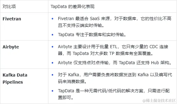 以下是 TapData 与其他一些热门数据集成工具选项的对比: