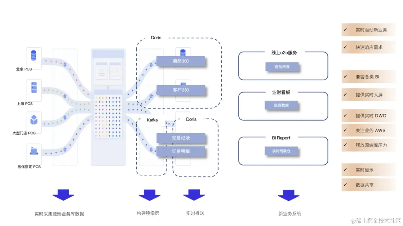 通过建立统一数据融合平台,该药企成功实现各门店 POS 数据的实时同步,在技术层面得以快速高效构建数据模型,进行数据标准化处理。实现实时汇聚、处理,降低数据链路的复杂度,高效为自有数仓(Doris)和 Kafka 供数。同时提供统一数据服务,支撑多源数据的实时分析和消费,从而加速下游创新业务的上线。