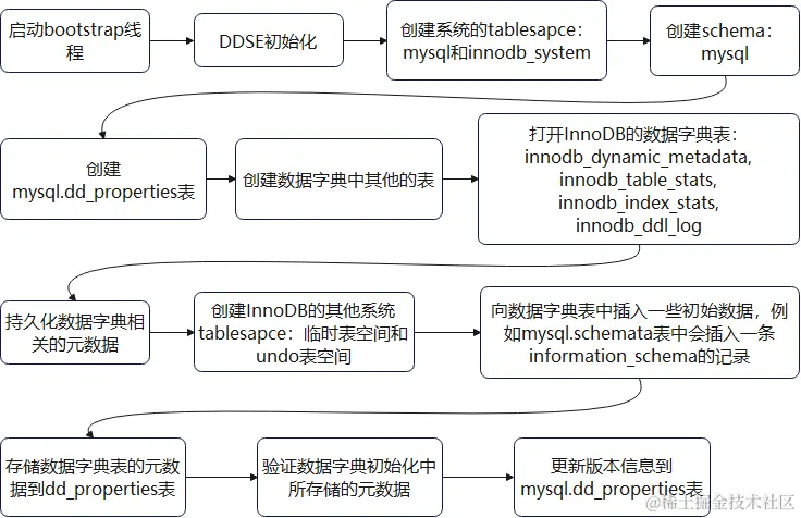数据字典的初始化函数入口是dd::bootstrap::initialize,主要流程如下:
