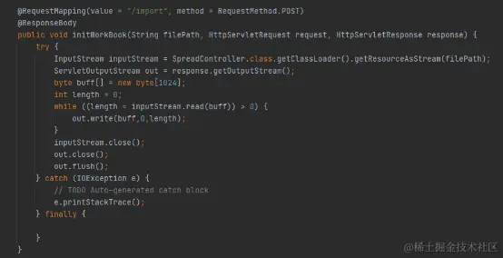 另外,我们会将流传到前端,所以会将流写到response中,所以参数中还需要response对象,方法本身不需要返回,返回空即可。原理是通过inputStream读取文件后,将其写入response的outputStream中。