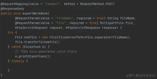 由于前端传入传入的是保存文件的名称以及文件blob文件流。服务器端需要两个参数,String用来接收文件名称,MultipartFile对象用来接收blob文件流。后端接受到文件流之后通过transferTo方法在指定目录下根军传来的fileName转存成新的文件。