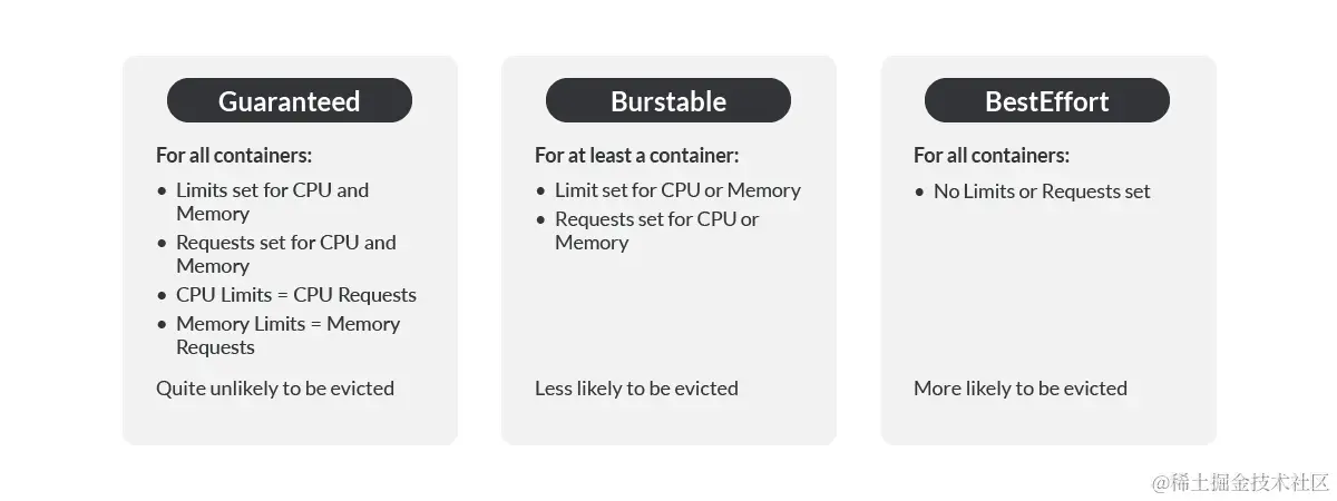 在 Kubernetes 中,如果 Pod 被赋予了以下三种 QoS 之一,这意味着它们在资源短缺情况下被驱逐的可能性等级,以下按照被驱逐的可能性从低到高排序: