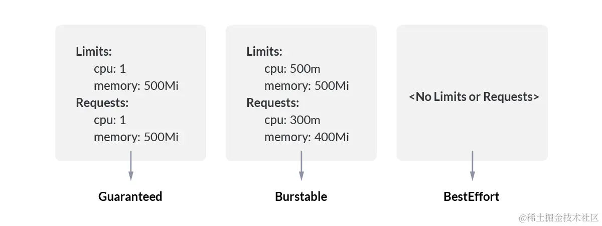 如何将这些 QoS 分配给 Pod 取决于 CPU 和内存的限制和请求值。