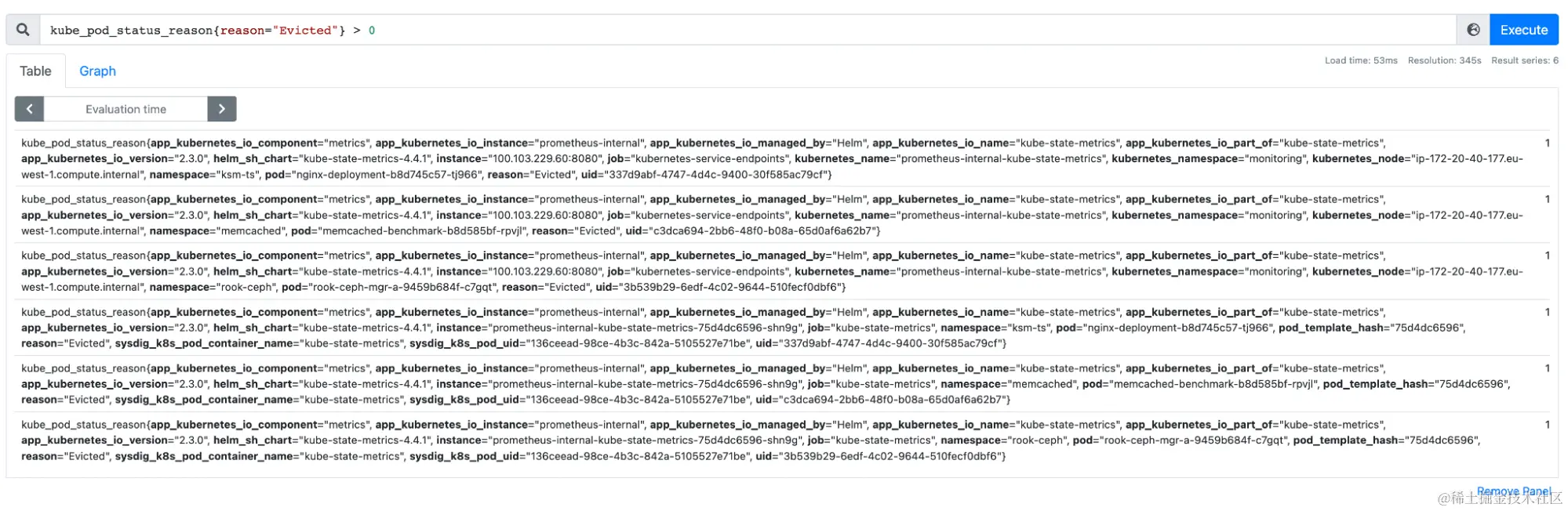 执行这一命令后,将显示集群中所有被驱逐的 Pod。您还可以将其与 kube_pod_status_phase{phase="Failed"} 配对,可以在 Pod 因失败而被驱逐时收到告警。