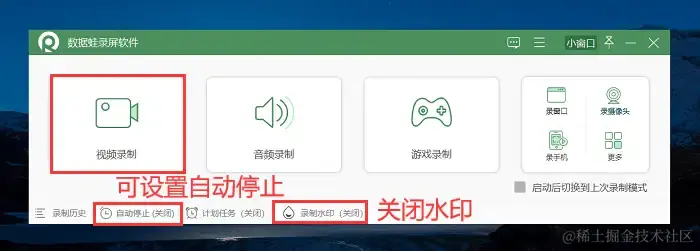 第二步:安装完成进入软件的主界面,有多种录制模式可以选择。这里将以 【视频录制】 为例。同时您还可以设置 【自动停止】 或 【关闭水印】 ,帮助您节约时间且录制出高清的视频内容。