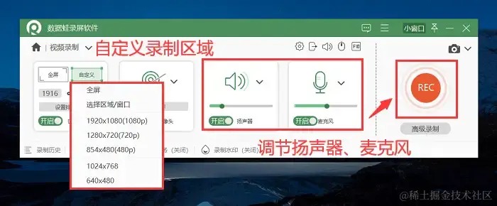 第三步:在 【视频录制】 页面,你可以进行自定义录制区域,对摄像头、扬声器、麦克风等进行调节。调节完毕,点击 【REC】 开始录制。