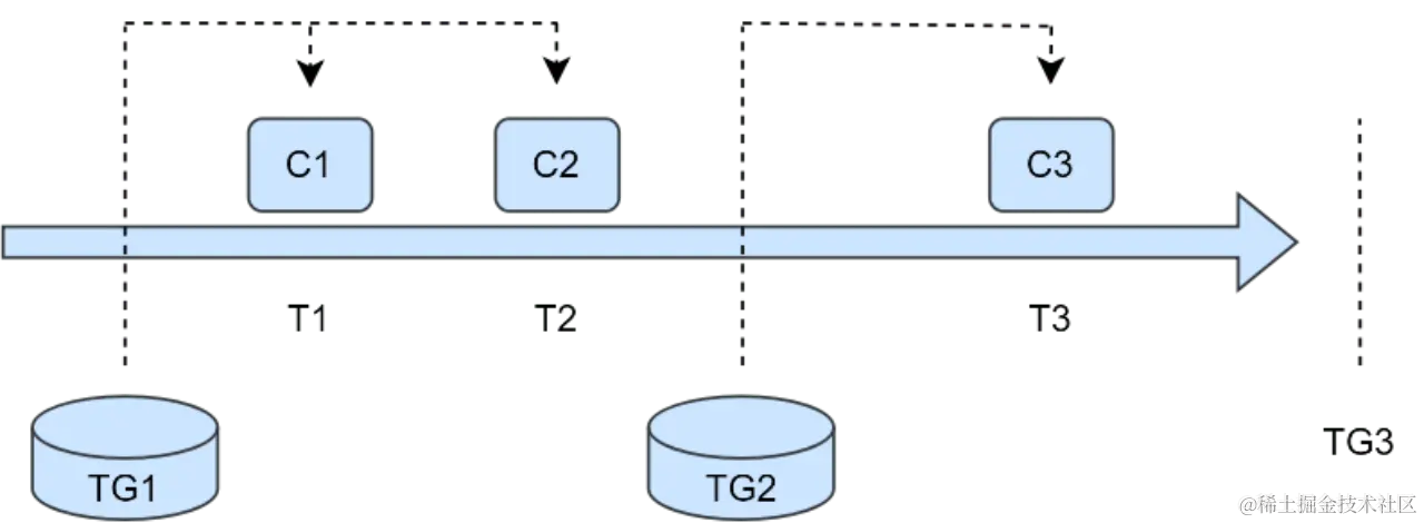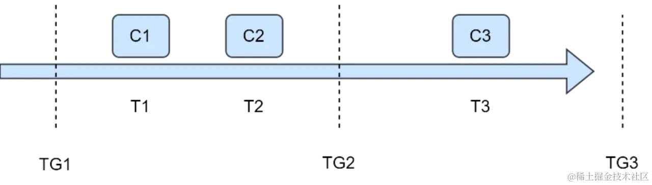 接下来,我们举个例子来具体说明数据的处理过程。现在假设一个项目A,它在历史上已经签约过两份合同,分别为C1和C2,它们的签约时间对应为T1和T2。实时数据中新流入一条合同签约记录C3,对应的时间为T3。将事件时间进行取整处理后,我们得到它们分别归属于起点为TG1和TG2的两个时间分段内。