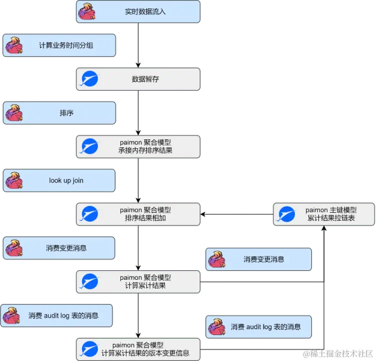 整个方案由若干Flink任务和Paimon模型组成,整体链路如下图。在这个方案中,实时流入的数据是整个流程的起点。这些数据在经过一系列的排序和处理后,会不断更新数据湖中的累计结果拉链表。这个拉链表不仅记录了累计结果的历史变化,还为后续的实时任务提供了历史时点的累计结果快照。通过这种方式,数据在整个方案中实现了循环流转和持续更新。
