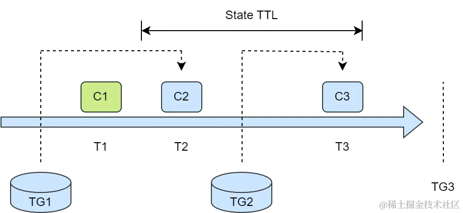 如图所示,C1和C2两条数据在业务时间分段起点TG2前后出现。当C1流入之后,累计结果拉链无法立刻将TG2时刻的快照版本从TG2-1更新到TG2-2。进而导致C2关联到的累计结果为未包含C1结果的TG2-1。