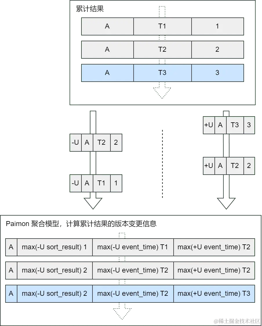 当然,对于那些已经失效的历史事件时间分段,其排序结果可能会因为数据清除而逐渐变小。为了解决这个问题,我们需要在排序操作的输出端取得每行数据排序结果的最大值。因此,在实际应用中,我们使用Paimon聚合模型来承接排序结果。