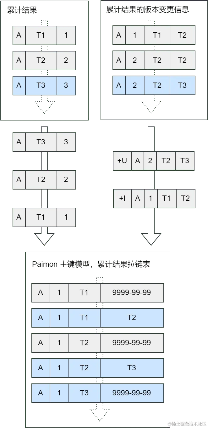 基于累计结果表的Audit Log记录,我们创建了一张Paimon表来存储累计结果每个版本的起止时间信息。这张表包含两组字段:第一组字段用于表示累计结果每个版本的起始时刻,我们通过不断解析累计结果的-U日志来更新这些字段;第二组字段则用于表示累计结果每个版本的终止时间,我们利用累计结果的+U日志来实时更新这些字段。通过这种方式,我们得以追踪并体现出了累计结果的版本变更信息。