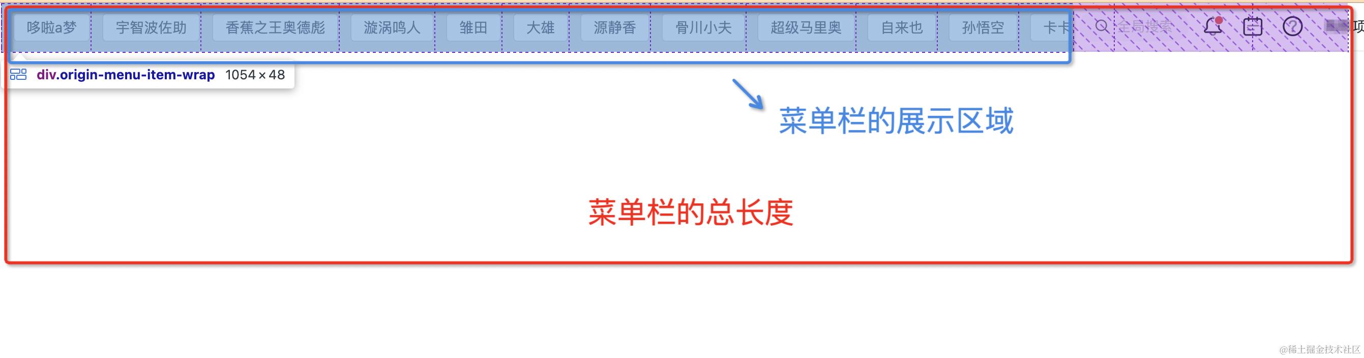 然后开始对menu-item元素宽度进行加和,当相加的宽度大于菜单展示区域的宽度clientWidth时,计算终止,此时的menu-item元素就是我们要截断的位置。