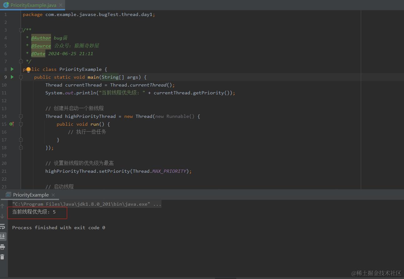 继续,保证学完这个概念,我们就下课。跟着我思考,何为线程优先级?这也得掌握,不得马虎。好理解的,见名知意。线程优先级它就是操作系统在进行线程调度时考虑的一个因素,它决定了线程获得CPU时间的相对顺序。线程优先级影响线程的调度策略,但并不保证高优先级的线程一定会先于低优先级的线程执行,因为线程的执行还受到其他调度因素(如线程状态、系统调度策略等)的影响。