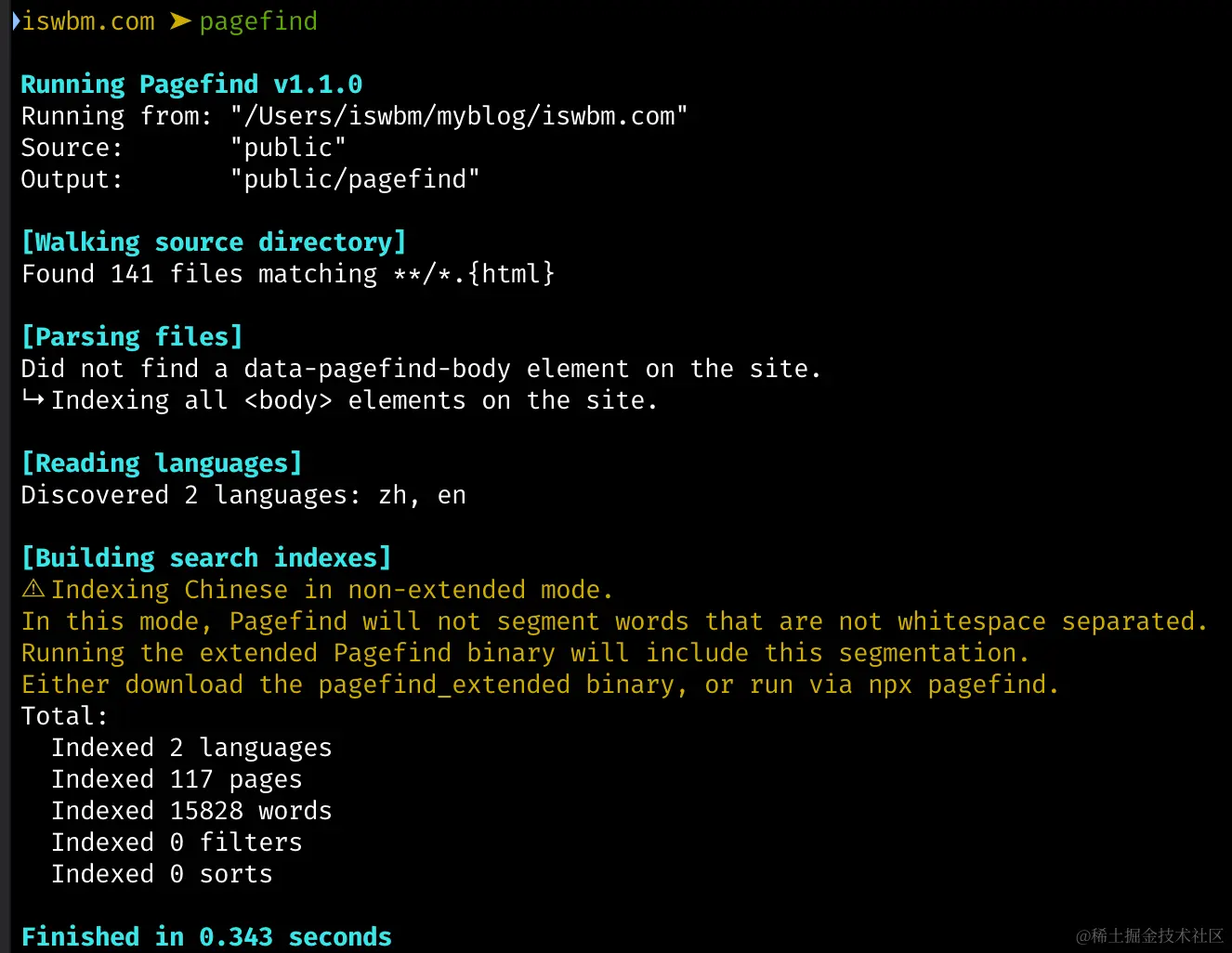 以后只需要直接执行 pagefind ,就会在 public/zh 目录下生成 pagefind 目录(即索引文件)