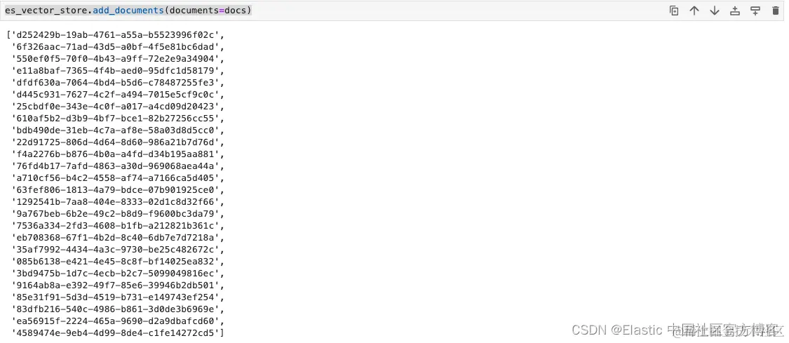 文档已被分块。我们在这里不使用任何特定的嵌入函数,因为标记是在索引时和在 Elasticsearch 内查询时推断出来的。这要求在 Elasticsearch 中加载并运行 ELSER v2 模型。