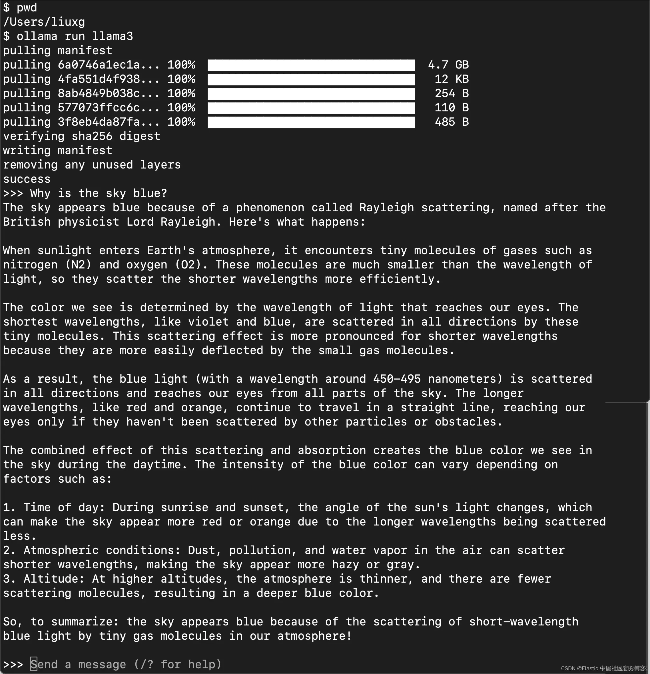 在我的电脑上,我使用 macOS 来进行安装。你也可以仿照文章 “Elasticsearch:使用在本地计算机上运行的 LLM 以及 Ollama 和 Langchain 构建 RAG 应用程序” 在 docker 里进行安装。