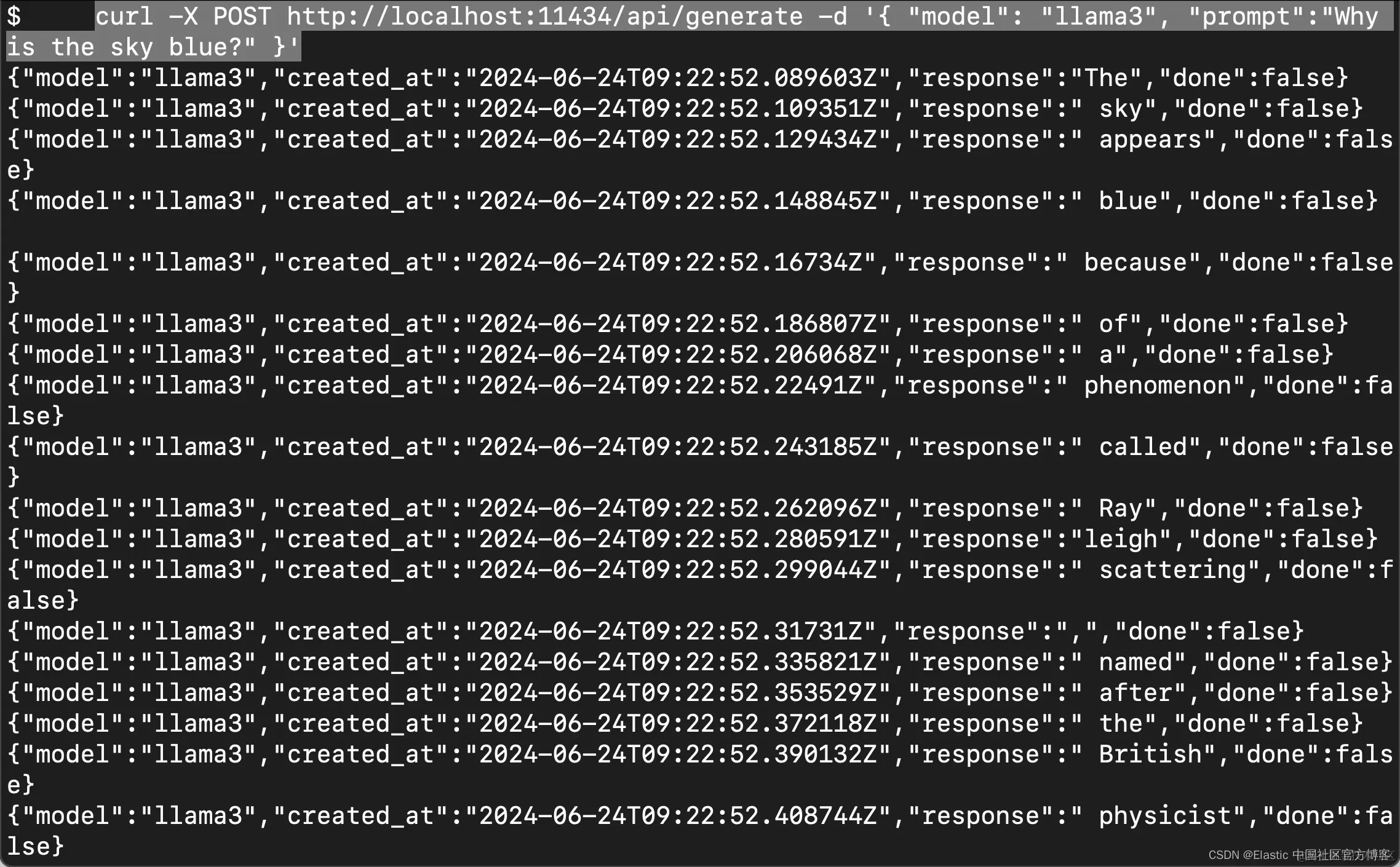 curl -X POST http://localhost:11434/api/generate -d '{ "model": "llama3", "prompt":"Why is the sky blue?" }'