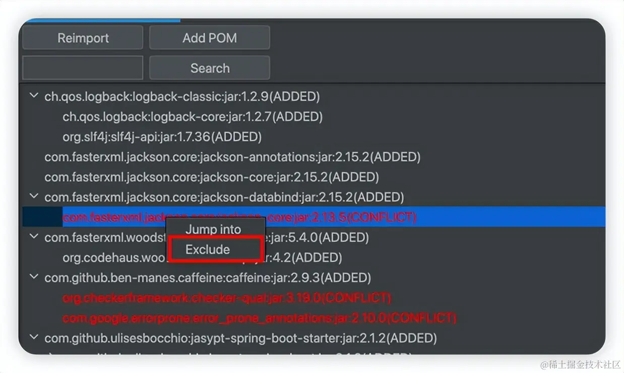 如上图,点击exclude后,pom文件对应的jar依赖会添加相应的exclude,此时你需要再点击一下reimport手动触发一次刷新,项目的maven依赖才会更新,并且树形结构的数据也会随之更新。