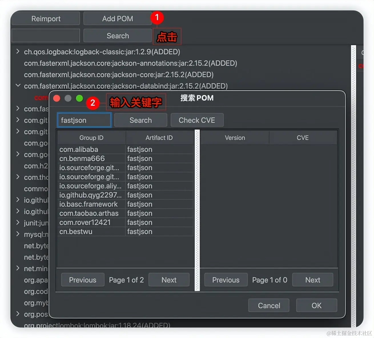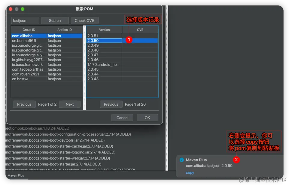 如上图步骤,在弹窗中,输入关键字后,左侧表格中会显示所有的匹配的选项,此时选择你需要的pom后