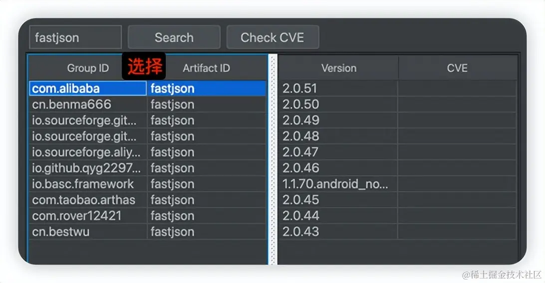 右侧会展示该pom的所有匹配的版本,此时你如果需要知道版本列表中的cve,可以手动点击Check CVE按钮进行检查,如果不需要则直接选择版本号记录